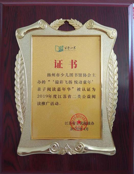 近日,江苏省全民阅读活动领导小组办公室公布了2019年度江苏省公益阅读推广活动认证扶持名单结果,扬州市少儿图书馆联合扬州市少儿图书馆协会举办的“‘溢彩飞扬 悦动童年’亲子阅读嘉年华”被认证为2019年度江苏省二类公益阅读推广活动。